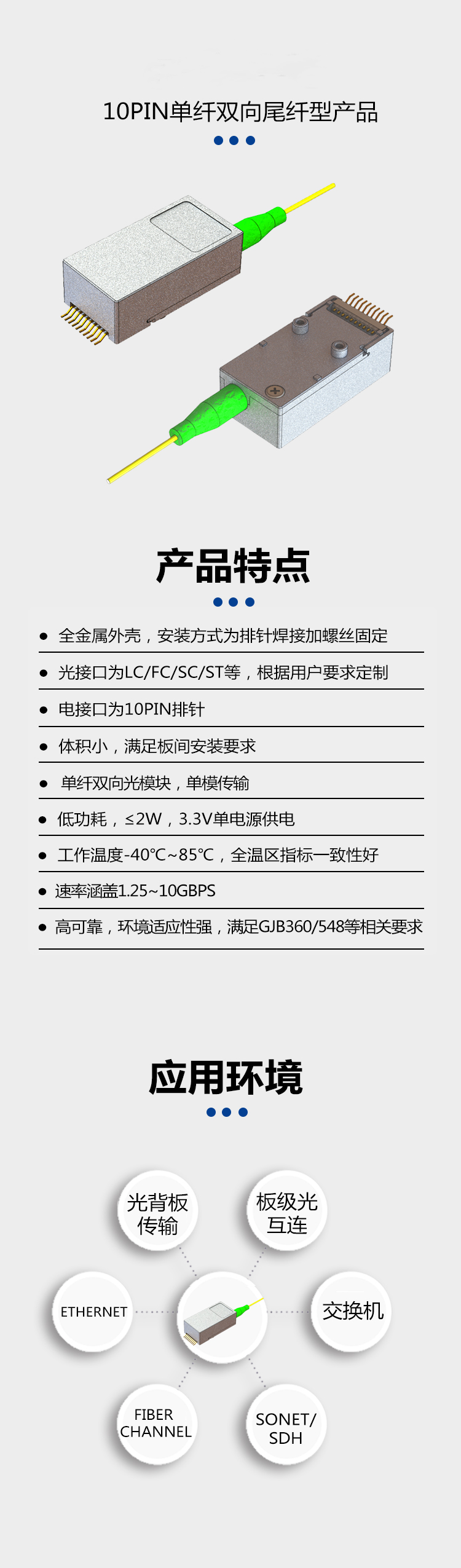 合新通信10PIN单纤双向尾纤型产品采用全金属外壳,安装方式为排针焊接加螺丝固定。光接口为LC/FC/ST/SC等,根据用户要求定制,电接口为10pin排针。体积小,满足板间安装要求。