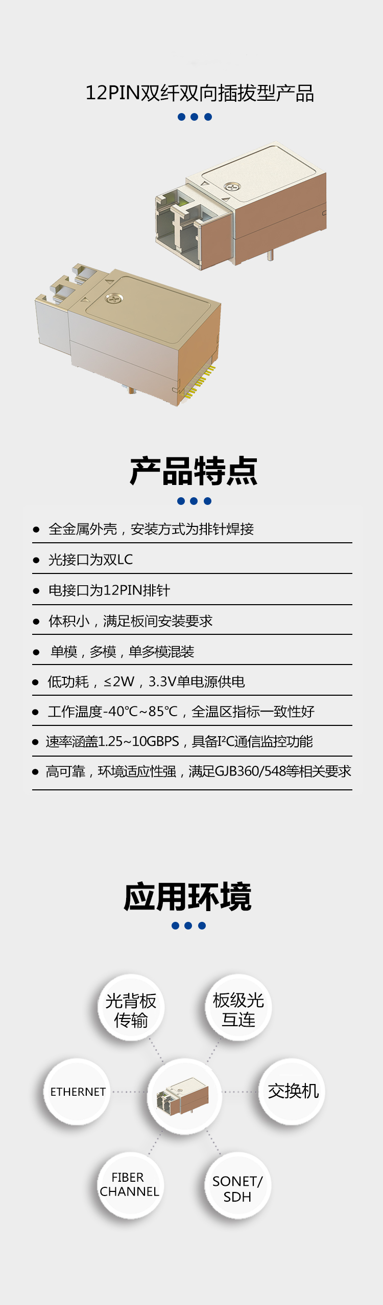 合新通信12PIN双纤双向插拔型产品,采用全金属外壳,安装方式为排针焊接加螺丝固定。光接口为双LC电接口为12pin排针。体积小,满足板间安装要求。