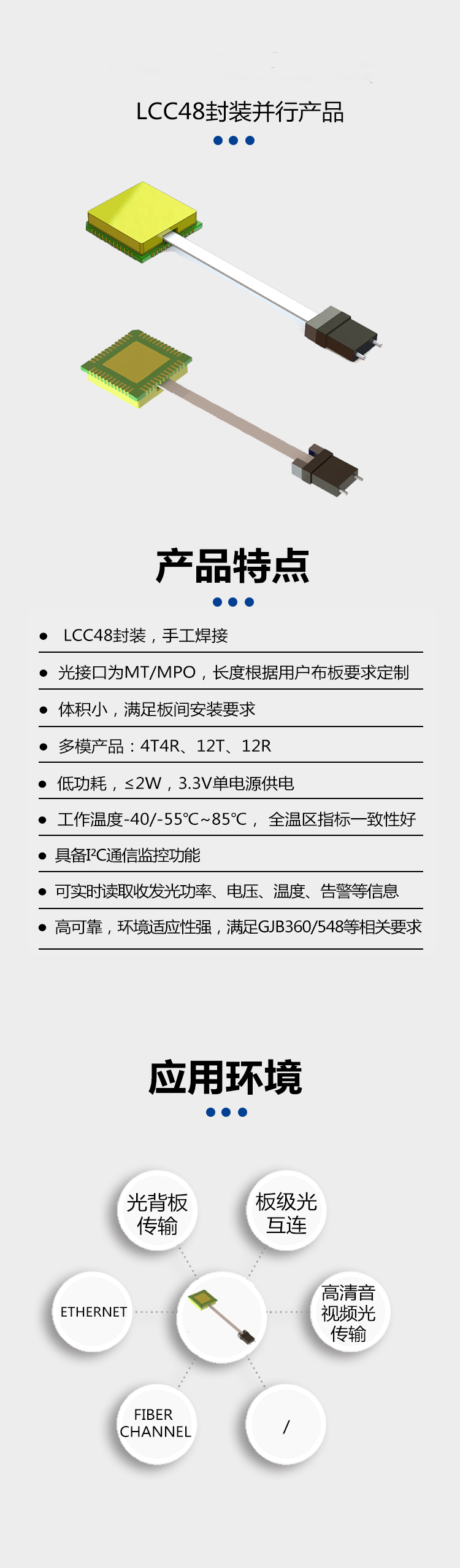 合新通信采用LCC48封装,手工焊接。光接口为MT/MPO,长度根据用户布板要求定制。体积小,16.4mmx16.4mmx4mm,满足板间安装要求。多模产品支持4T4R、12T、12R