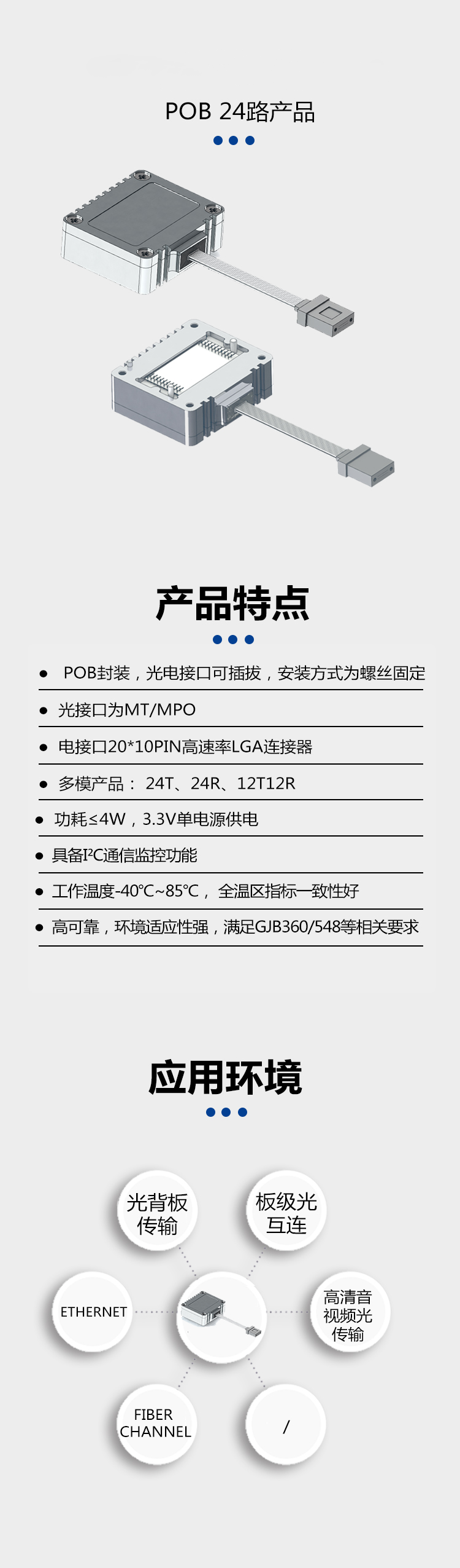 合新通信的POB24路并行封装产品,光电接口可插拔,安装方式为螺丝固定。光接口为MT/MPO,电接口20*10pin高速率LGA连接器。多模产品24T、24R、12T12R.