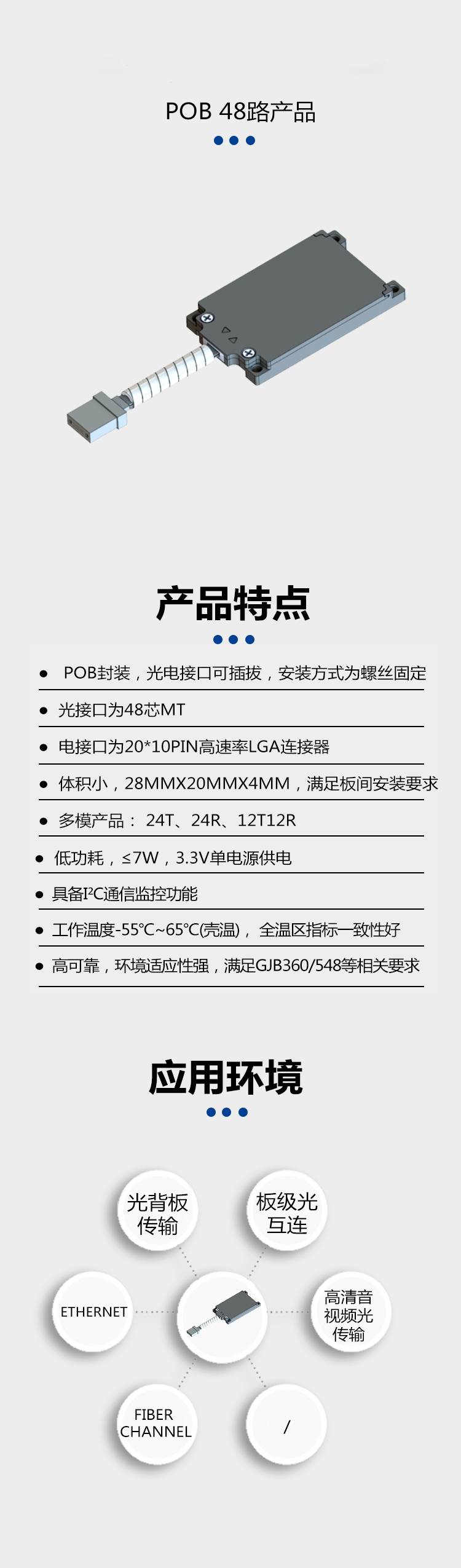 合新通信的POB48路并行产品,光电接口可插拔,安装方式为螺丝固定。光接口48芯MT,电接口为20*10pin高速率LGA连接器。体积小,28mmx20mmx4mm,满足板间安装要求。
