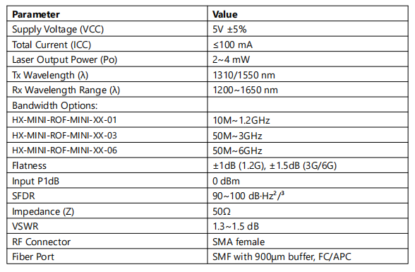HX-MINI-ROF系列小型模拟宽带光收发模块是一款低成本、高性能的模拟宽带光收发器,具有非常宽的动态范围,专为光纤射频应用而设计。一对收发器将创建双向射频到光和光到射频转换及传输链路, 可以提供高杂散自由动态范围(SFDR),多个工作带宽可选。标准光学连接器是用于低背反射应用的FC/APC,RF 接口是通过一个50 欧姆的SMA 连接器。接收机采用高性能InGaAs光电二极管,发射机采用线性光隔离DFB激光器,光纤采用9/125 μm 单模光纤,工作波长1310nm 或1550nm。